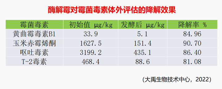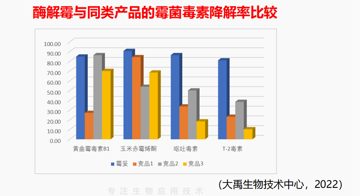 大禹生物的生物降解霉菌毒素產(chǎn)品是通過復(fù)合微生態(tài)制劑來表達氧化還原酶(去氧環(huán)化酶)、水解酶、轉(zhuǎn)移酶等霉菌毒素降解酶,降解霉菌毒素的毒性基團、破壞霉菌毒素活性中心,致使霉菌毒素毒性變?nèi)趸蜃兂蔁o毒物質(zhì)。