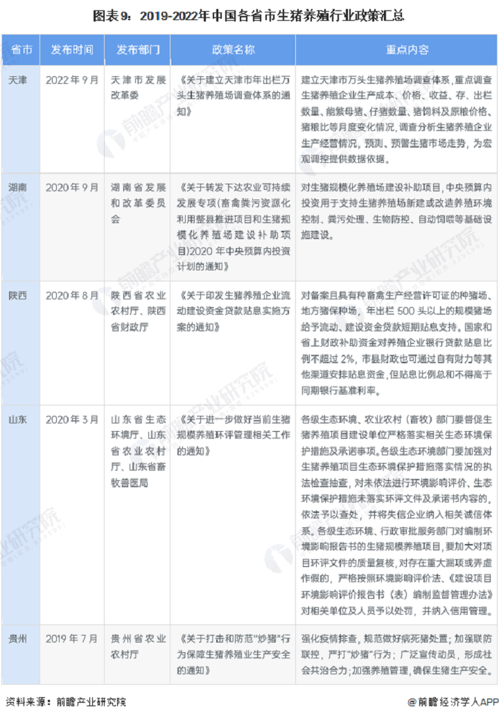 2019-2022年,天津、湖南、陜西、山東等部分省市也發(fā)布了生豬養(yǎng)殖行業(yè)政策,主要涉及資金貸款補貼、生態(tài)環(huán)境保護、打擊防范“炒豬”行為等。